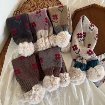 ילדים אופנתיים הצוואר פסים מצורפים צעיפים פרח צבעונים jquard צלב טוויסט הסגר faux פרווה כדור pom בנות חורף חמוד צעיף